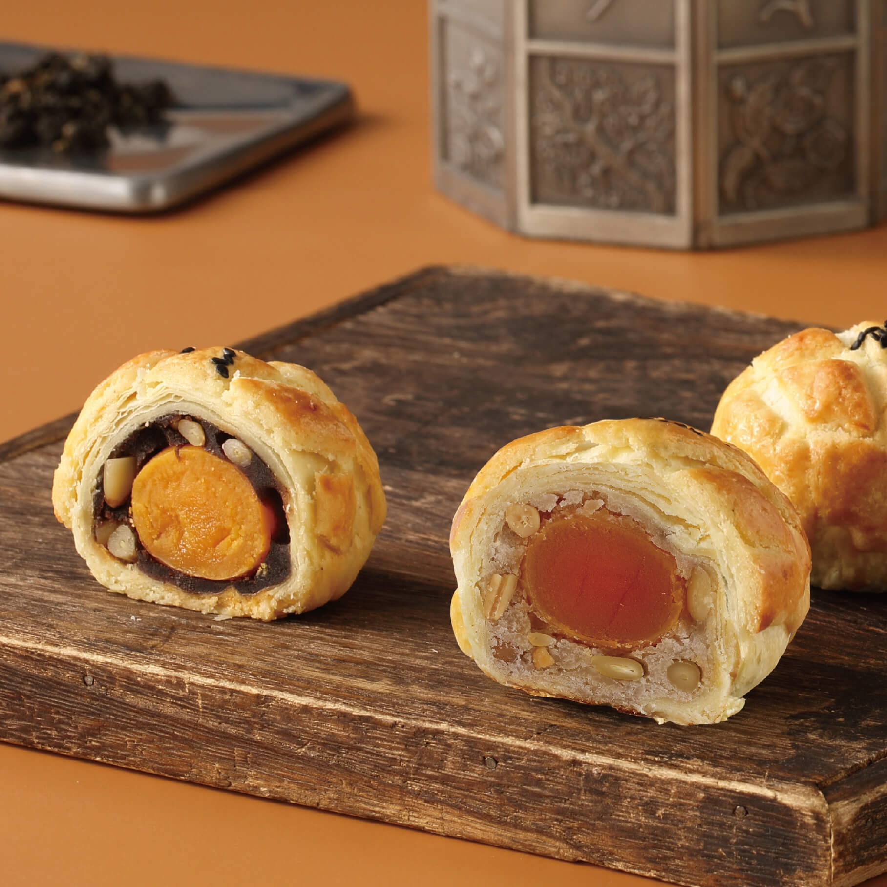 紅豆餡(紅豆、糖、大豆油)、鹹蛋黃、麵粉、奶油、海藻糖、奶粉、松子、芝士粉、鹽、香草莢醬